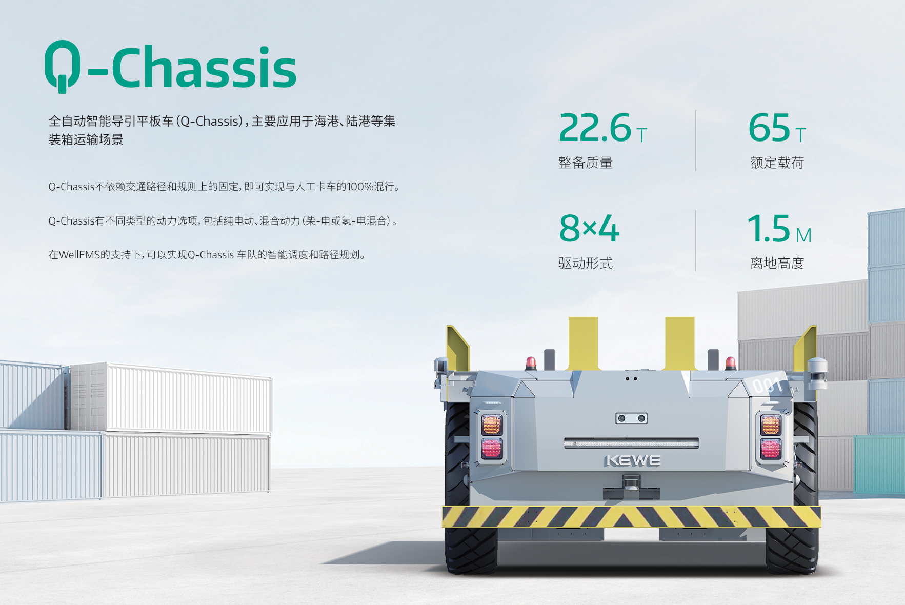 Q-Chassis (又称IGV)是西井科技 Qomolo 智能驾驶家族的核心产品, 集智能、绿色、安全优势于一体。其创新的四轴八轮双驱动设计,可实现同向或逆向转动,轻松解决重载车辆 “转弯难” 的行业痛点;搭载自研多传感器融合驾驶平台,无需磁钉部署即可实现 360° 全环境感知;配合高精度定位系统,场内停车精度可达 ±30mm;同时配备电子防撞激光雷达与机械式防撞装置,全方位守护作业安全。