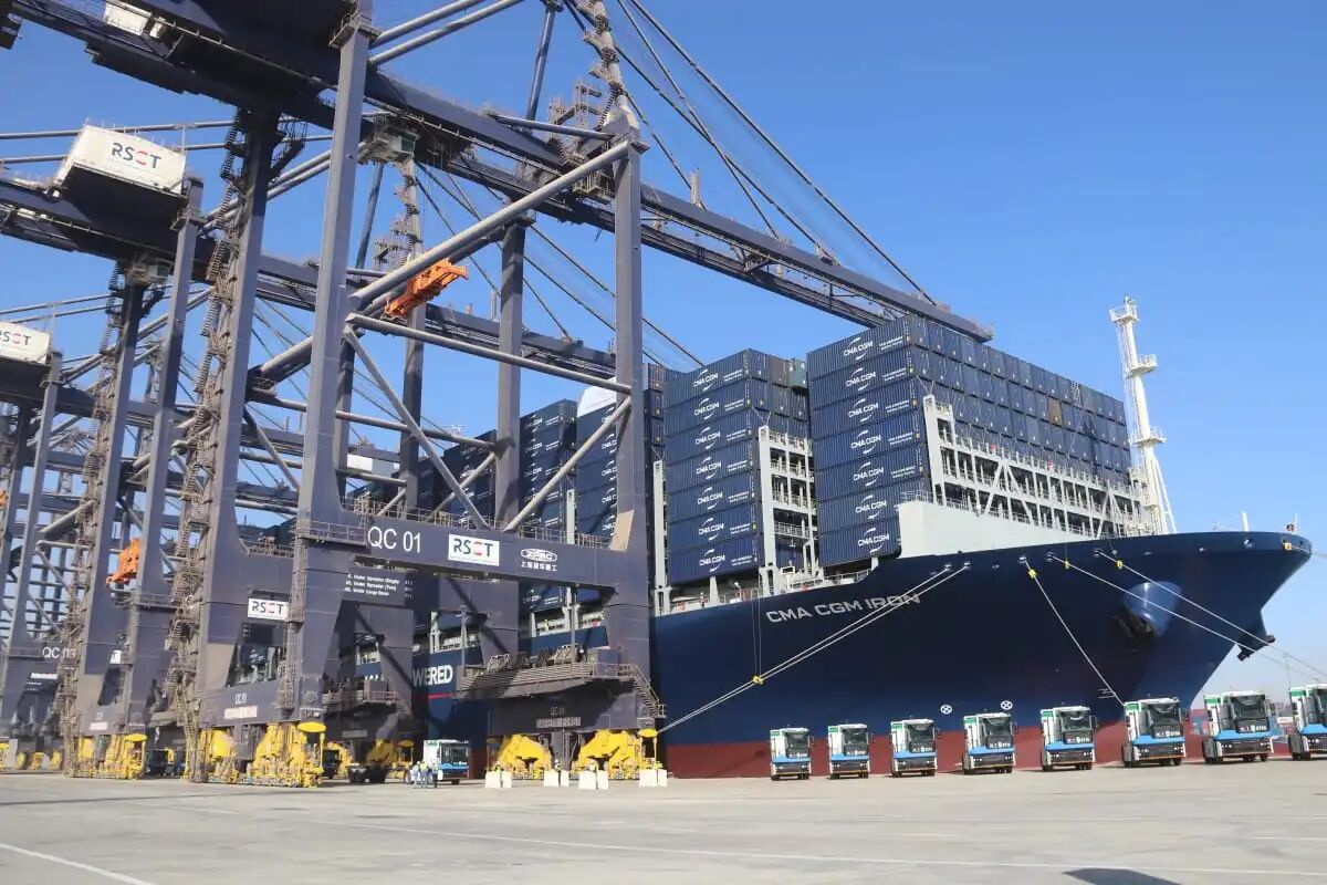 一期拥有1200米岸线及18米水深,年产能170万TEU,未来将扩展至350万TEU,覆盖总长2.6公里岸线。码头采用全电动绿色设计,配备西井科技电动E-Truck车队、自动化轮胎吊(RTG)、远程控制岸桥(STS)及电动叉车等先进设备,全方位实现低碳排放,践行绿色化运营承诺。