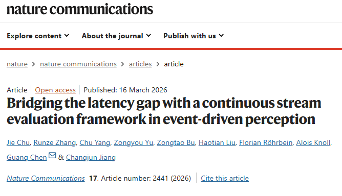 2026年3月16日,《Nature Communications》发表了题为《Bridging the latency gap with a continuous stream evaluation framework in event-driven perception》的研究论文,旨在研究现有视觉评估体系在实时应用中的时延缺陷问题,引入基于事件流式感知的STARE框架,聚焦一个关键却长期未被充分关注的原则:事件相机连续感测、模型计算与现实任务需求之间的时间一致性,系统性地弥合事件相机(Event Camera)在理论速度和实际应用之间的时延鸿沟,为开发真正低延迟、高可靠的实时事件视觉系统奠定了基础。